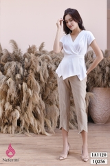 Kiểu dáng: Áo peplum cổ xếp vạt chéo, xếp rúm nhẹ ở eo, tay cộc ngắn
