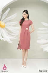 Đầm cổ thuyền ngang, tay ngắn, đính hoa eo trang trí