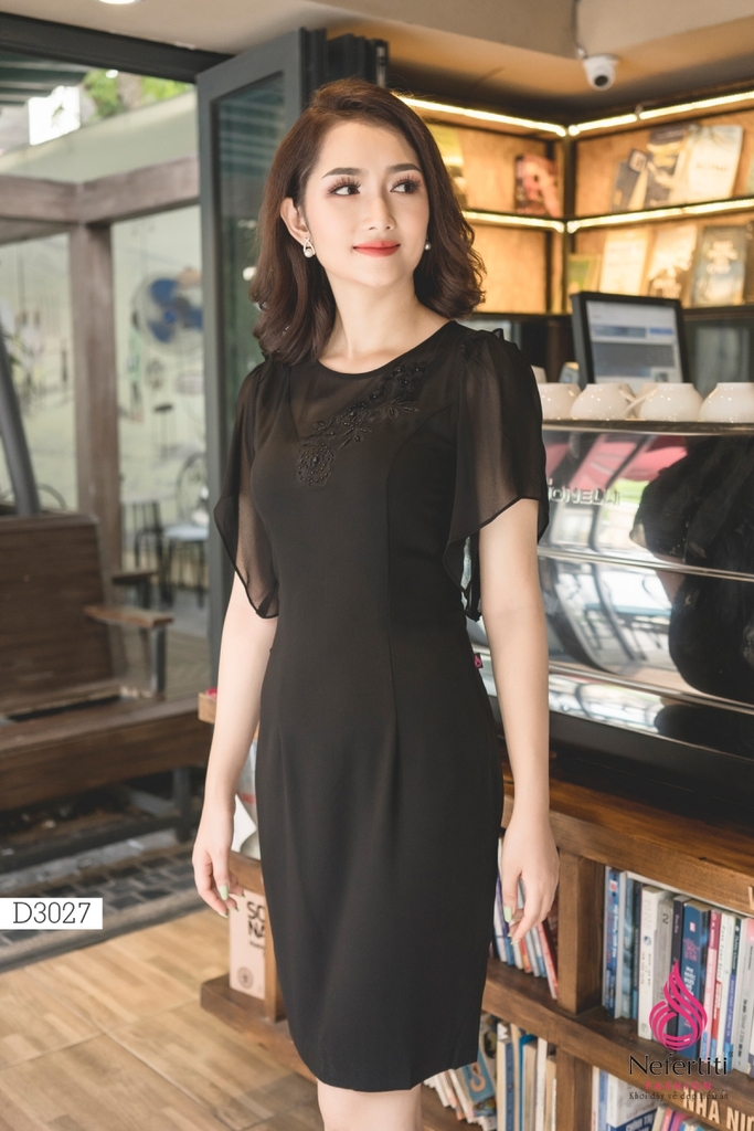 Đầm dáng ôm tay lơi, cổ tròn rộng, trên ngực đính cườm trang trí họa tiết hoa