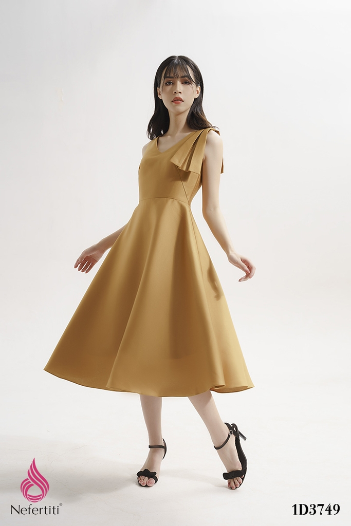 Đầm sát nách dáng xòe, kiểu dáng sang trọng, cổ V, vai đính nơ cách điệu thích hợp đi dự tiệc