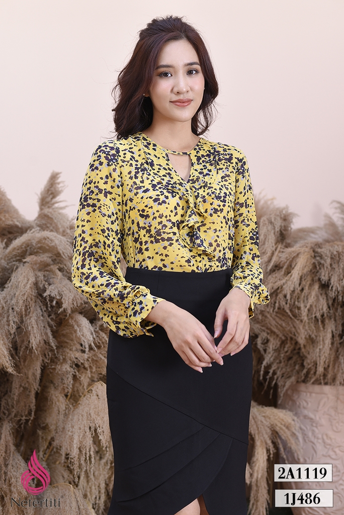 Kiểu dáng: Sơ mi dáng hơi suông, cổ tròn xẻ V giữa, bèo đổ ở cổ