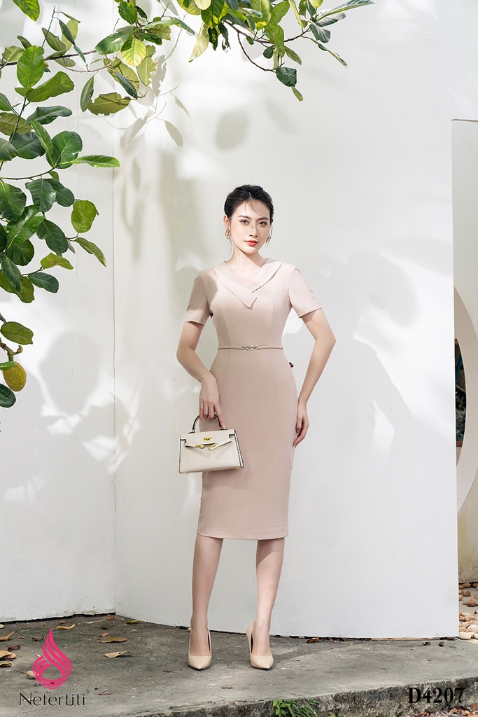 Đầm dáng ôm, cổ V bẻ, đai điệu đà